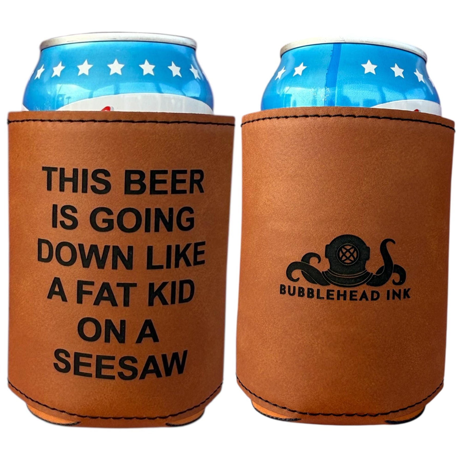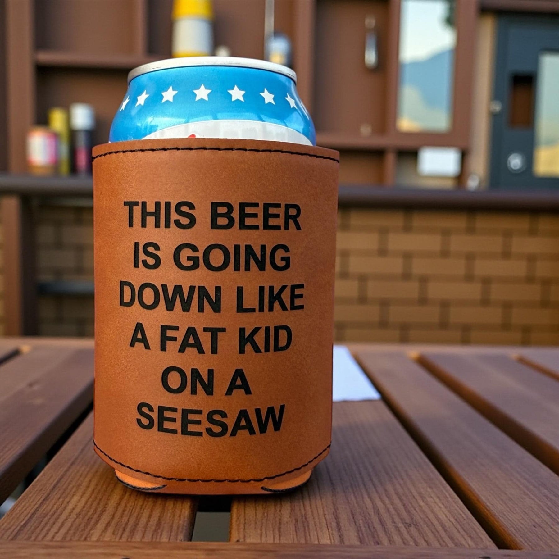 Our funny beer can cooler features the unapologetic saying “This Beer Is Going Down Like a Fat Kid on a Seesaw”. Laser-engraved for crisp contrast on a faux leather sleeve that brings laughs without sacrificing quality.