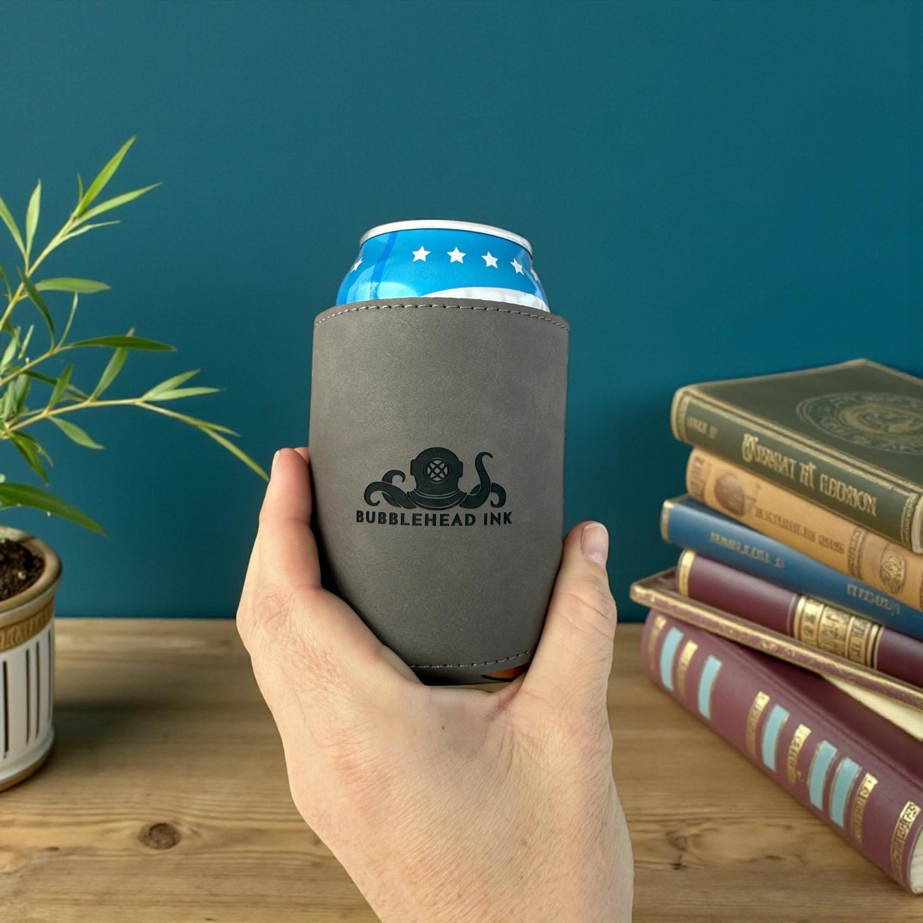 Details - Features chosen phrase on one side, our logo on the other • Fits standard 12 oz cans & bottles • Leather-look laserable material with stitched edges • Water-resistant & wipe-clean surface • Laser-engraved design for long-lasting contrast • Lightweight and easy to pack for parties, trips, and tailgates
